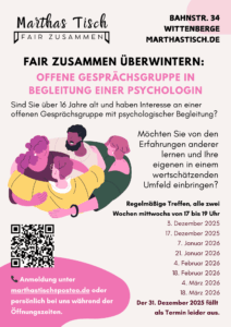 Möchten Sie von den Erfahrungen anderer lernen und Ihre eigenen in einem wertschätzenden Rahmen einbringen?📞 Anmeldung unter marthastisch@posteo.de oder persönlich bei uns während der Öffnungszeiten.